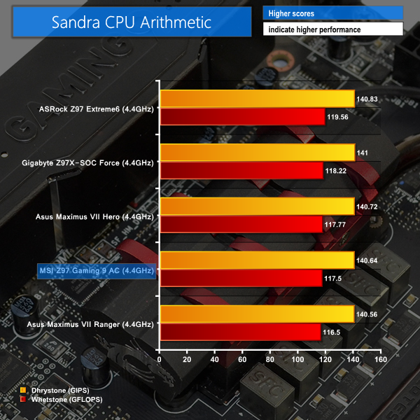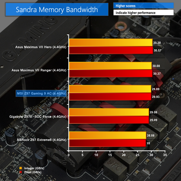 Both the Sandra memory bandwidth and processor arithmetic benchmarks place the MSI Z97 Gaming 9 AC around a middle-of-the-road spot in our charts.