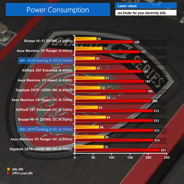 Low idle power consumption levels are a positive for the Z97A Gaming 6. The board rapidly adjusts system voltages when higher performance is not required.