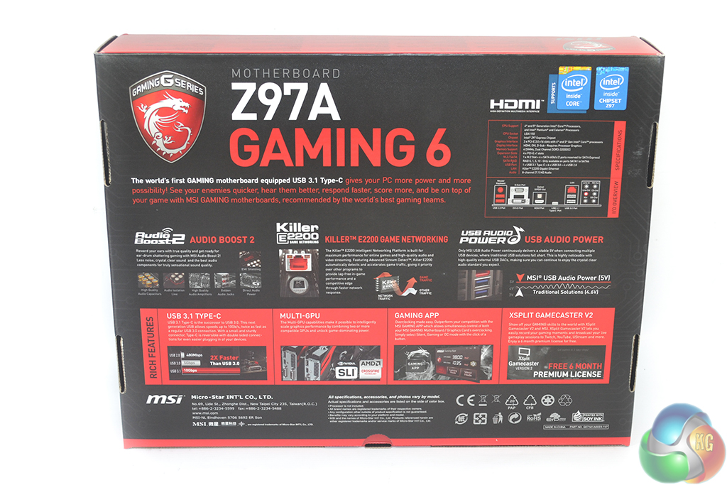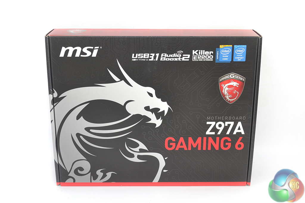 MSI ships the Z97A Gaming 6 in packaging which is typical for its Gaming motherboards. The well-known dragon and some key features are outlined on the front side, while detailed specifications are shown on the rear.