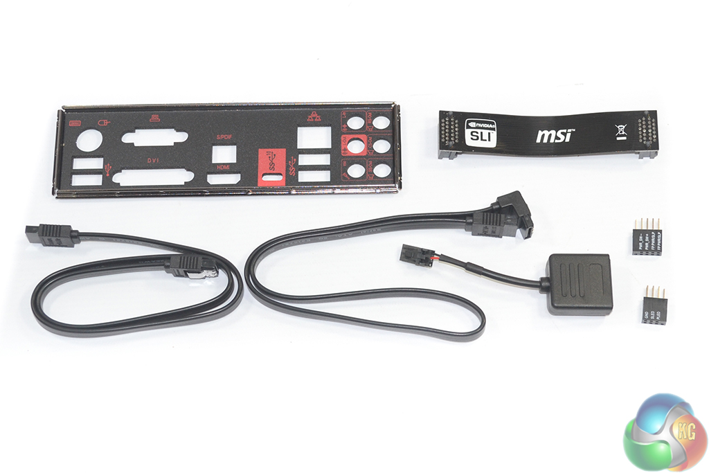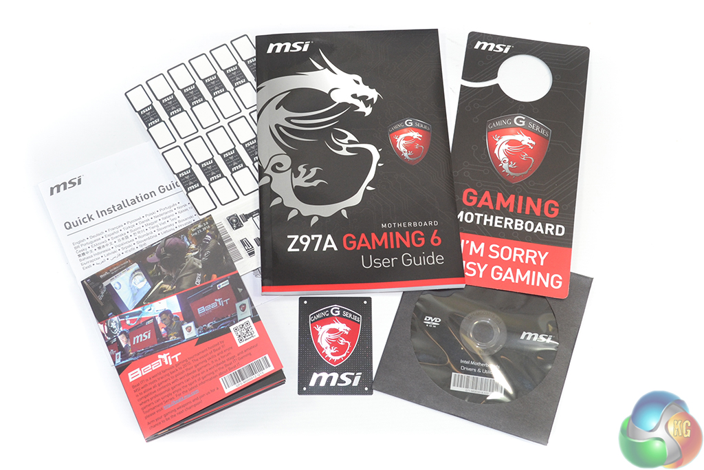 MSI includes more than the standard affair of documentation, stickers, and driver CD. There is also a comical door hanger and labels for cables inside your chassis (which are especially convenient if you ever have to remove drives).