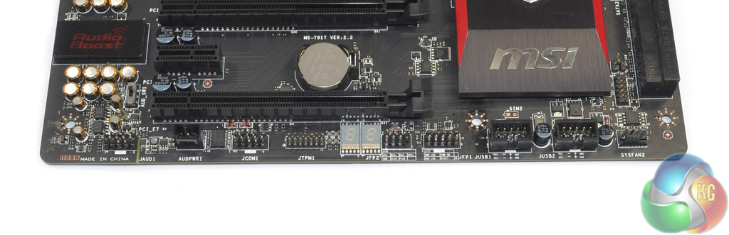 The usual affair of front panel headers and positioning is present. MSI also adds a header which can be used to boost the power delivery to the motherboard’s audio system. A debug LED is a pleasant addition for a mid-range Z97 motherboard.