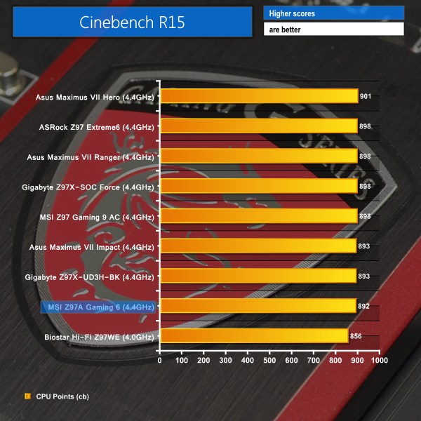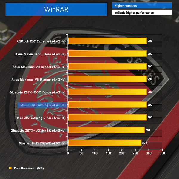 Cinebench performs unfavourably on the MSI Z97A Gaming 6, rewarding it with a points score that is slightly below the average. WinRAR places MSI's board in equal-first place.