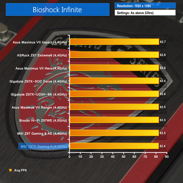 Despite two bottom-place finishes, there is no cause for concern by the MSI Z97A Gaming 6 motherboard's frame rate performance. The narrow defeat in Bioshock Infinite is by no more than a few tenths of a frame. Tomb Raider performance is about half a frame behind the majority of our comparisons, although this could be related to subtle differences in the test system's operation.