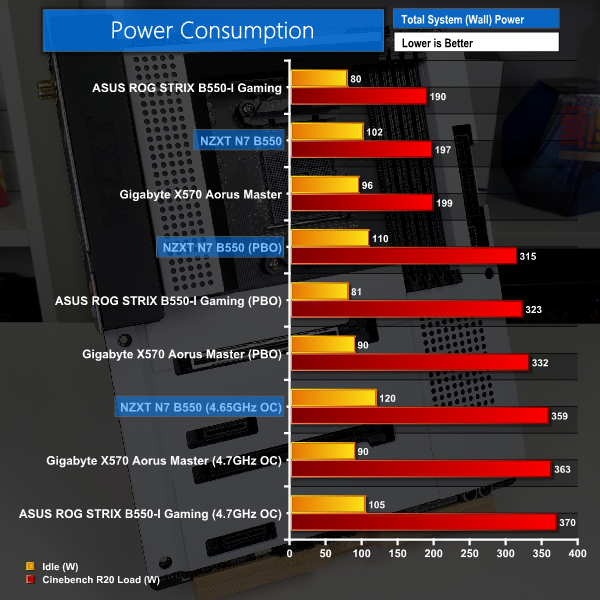 Idle wall power draws are a little high on NZXT’s motherboard. But the load numbers fall in line with the competition and are actually a little better under PBO and manual overclocked loads due to slightly reduced frequencies for the N7 B550 by comparison.