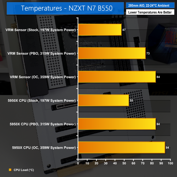 Temperatures are all round very good on the NZXT N7 B550. Sensible stock settings and good overclocked voltage accuracy mean that the CPU stays in check under a variety of operating frequencies and a 280mm Asetek AIO.