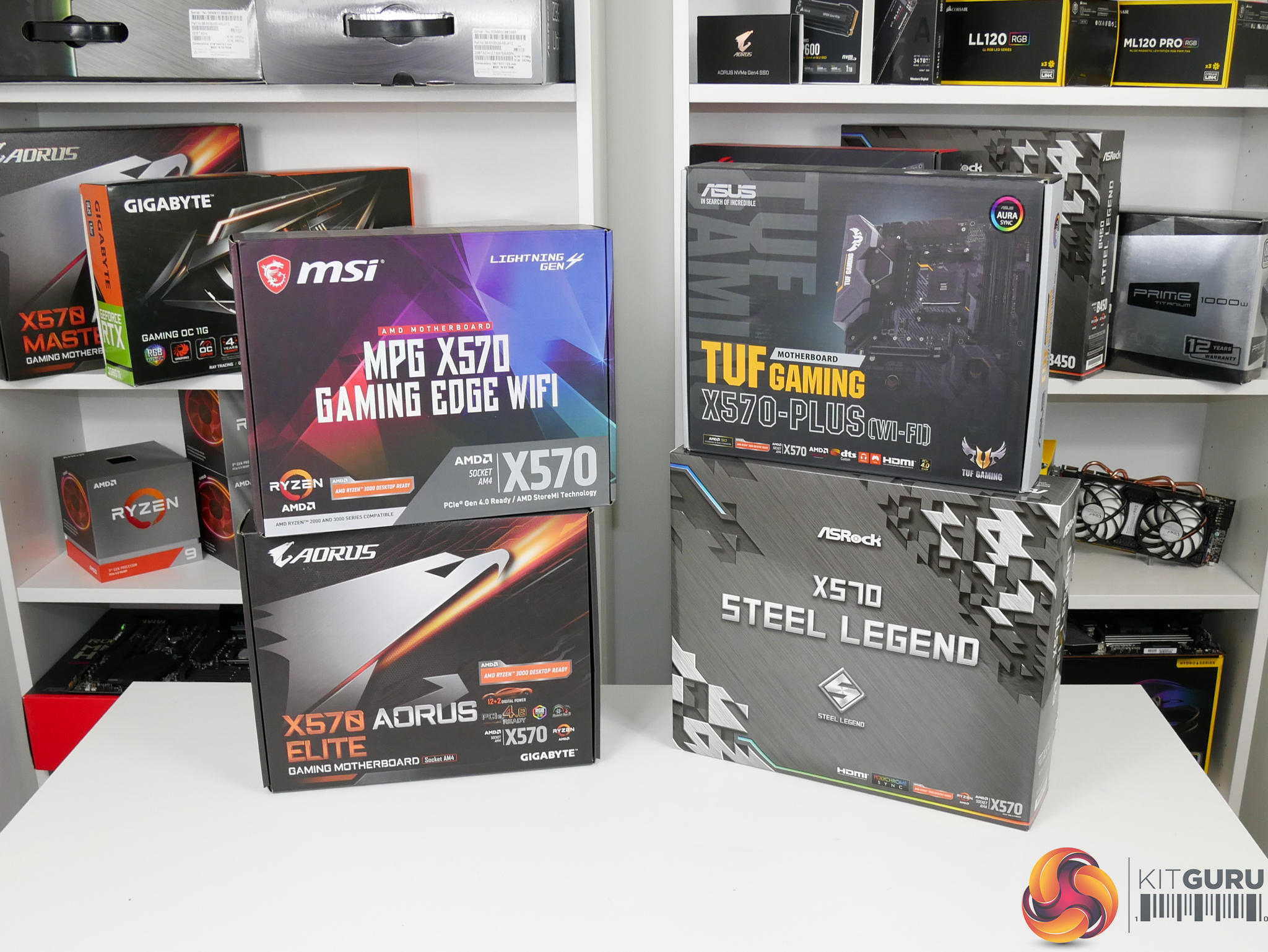 For ASRock, we got a sample of the £210 X570 Steel Legend. ASUS sent across the TUF Gaming X570-Plus Wi-Fi, which is the same as the £210 non-Wi-Fi version for this test. We bought Gigabyte's £210 X570 Aorus Elite. And MSI's MPG X570 Gaming Edge WiFi was put on the credit card.