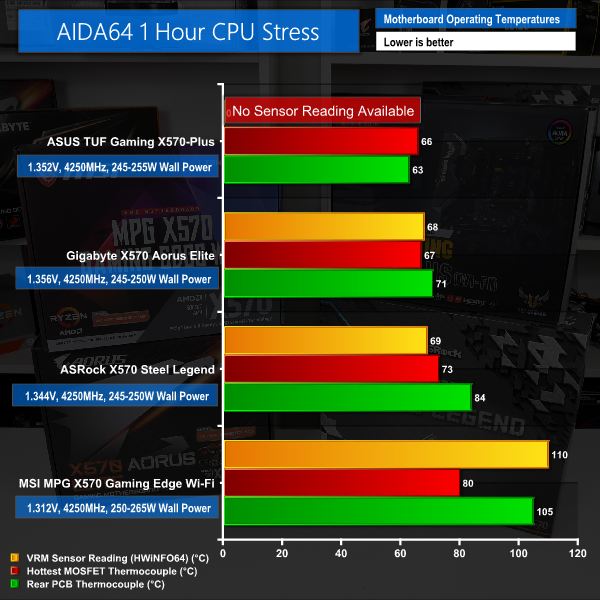 Despite the ASUS board offering marginally better temperatures for the MOSFETs overall, the accurate in-built temperature sensor for Gigabyte’s X570 Aorus Elite was a clear positive. It is a shame that ASUS’ motherboard does not display VRM temperature readings in OS-based monitoring software. Based on our testing, ASUS shows excellent performance and has absolutely nothing to hide.