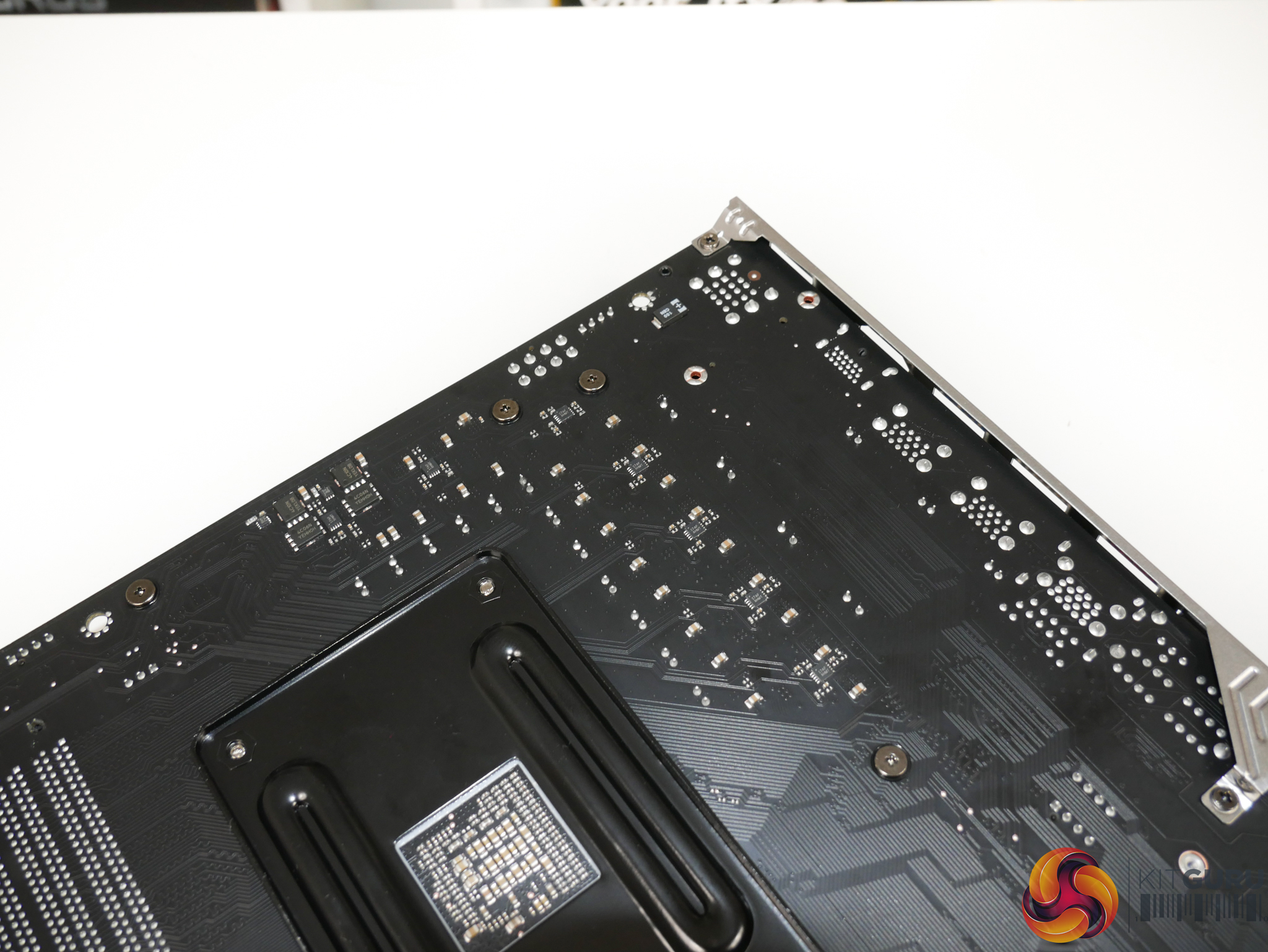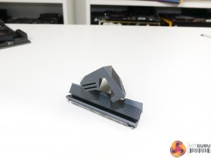 The larger left-side heatsink weighs 133 grams while the smaller top heatsink is 60 grams. That roughly 2:1 heatsink mass split looks to be pretty smart as the heavier left-side heatsink is tasked with handling nine of the CPU VCore power phases while the smaller top-side heatsink manages three CPU phases and the two SoC phases.