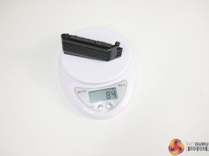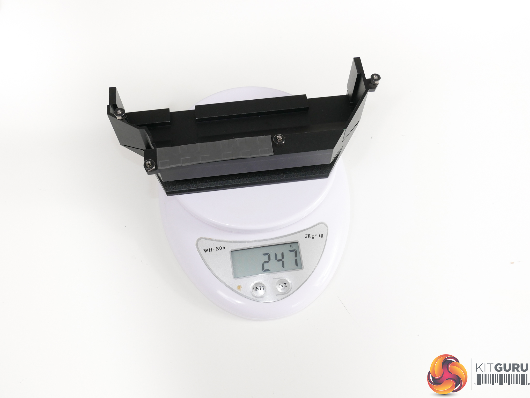 The larger left-side heatsink weighs a massive 247 grams while the smaller top heatsink is a solid 84 grams. Clearly, MSI is aiming for a brute force approach at dealing with the heat output from its less efficient MOSFET solutions.