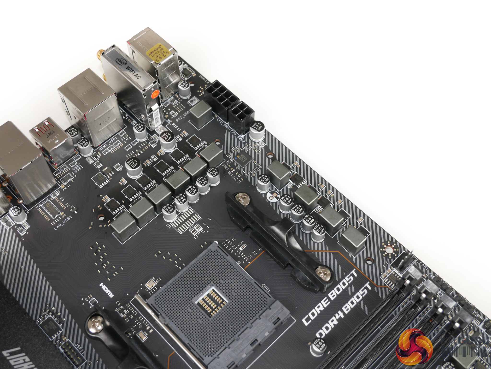 That roughly 3:1 split for heatsink mass is pretty much ideal, as the larger left side heatsink is tasked with cooling six CPU power phases while the smaller top heatsink is given two phases to cool, plus the less-demanding SoC VRM.