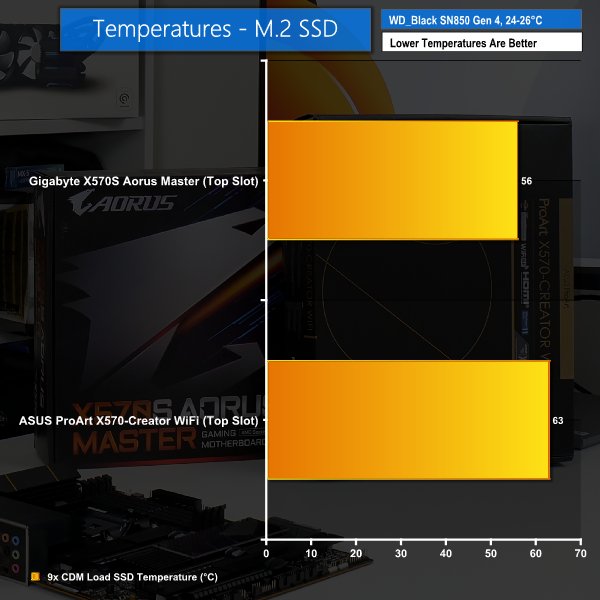 The WD_Black SN850 1TB NVMe SSD is installed in the top slot of each motherboard. We test the cooling performance by measuring the temperature recordings during nine back-to-back runs of the CrystalDiskMark sequential read/write test.