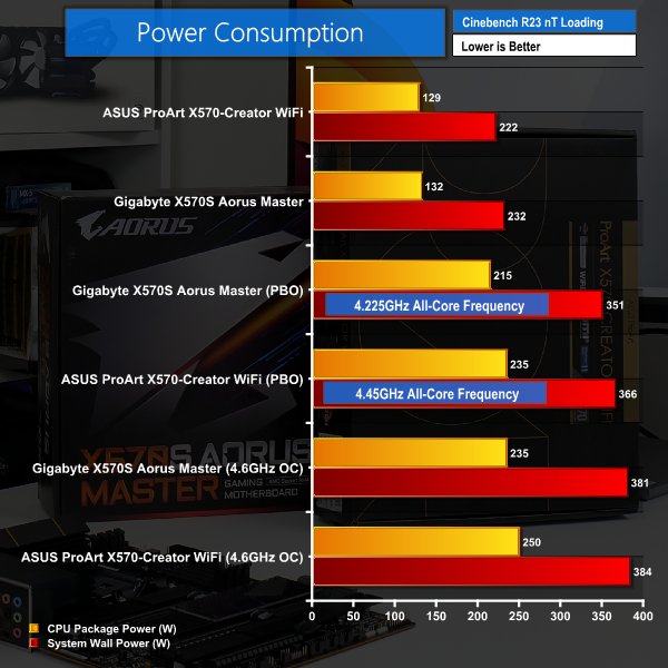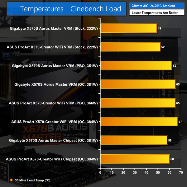 Gigabyte takes another small temperature victory in the VRM cooling department. With the X570S Aorus Master pulling 381W wall power, it actually manages to keep its VRM running a couple of degrees below the ASUS board at a similar power level. We also see VRM cooling outperformance at stock clock speeds.