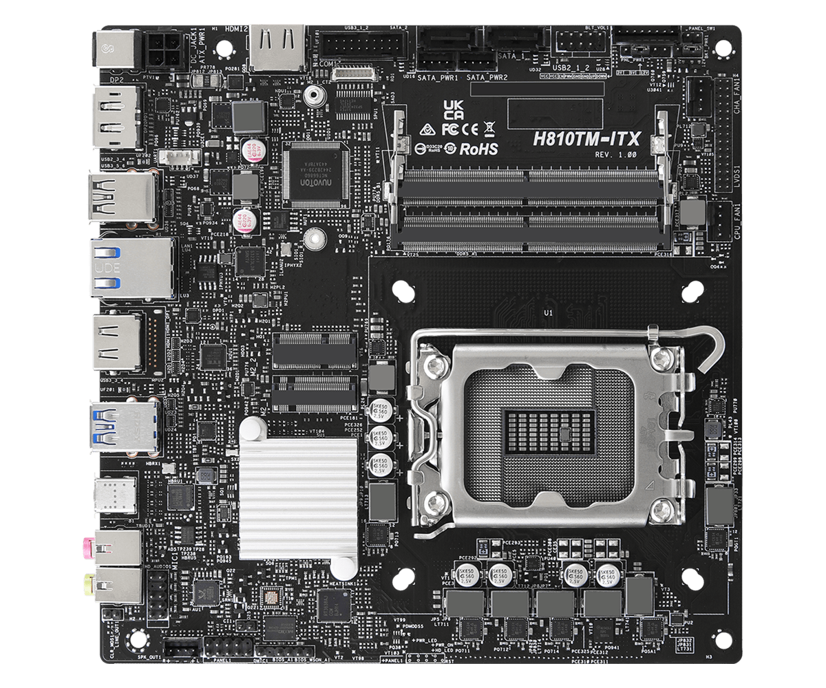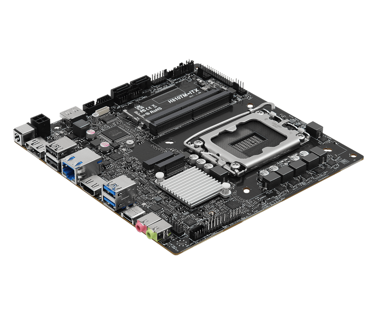 The ASRock H810TM-ITX supports Intel Core Ultra Series 2 processors and dual DDR5 memory configurations. Despite the small size, this motherboard does support up to four storage drives, and has outputs for up to five displays.