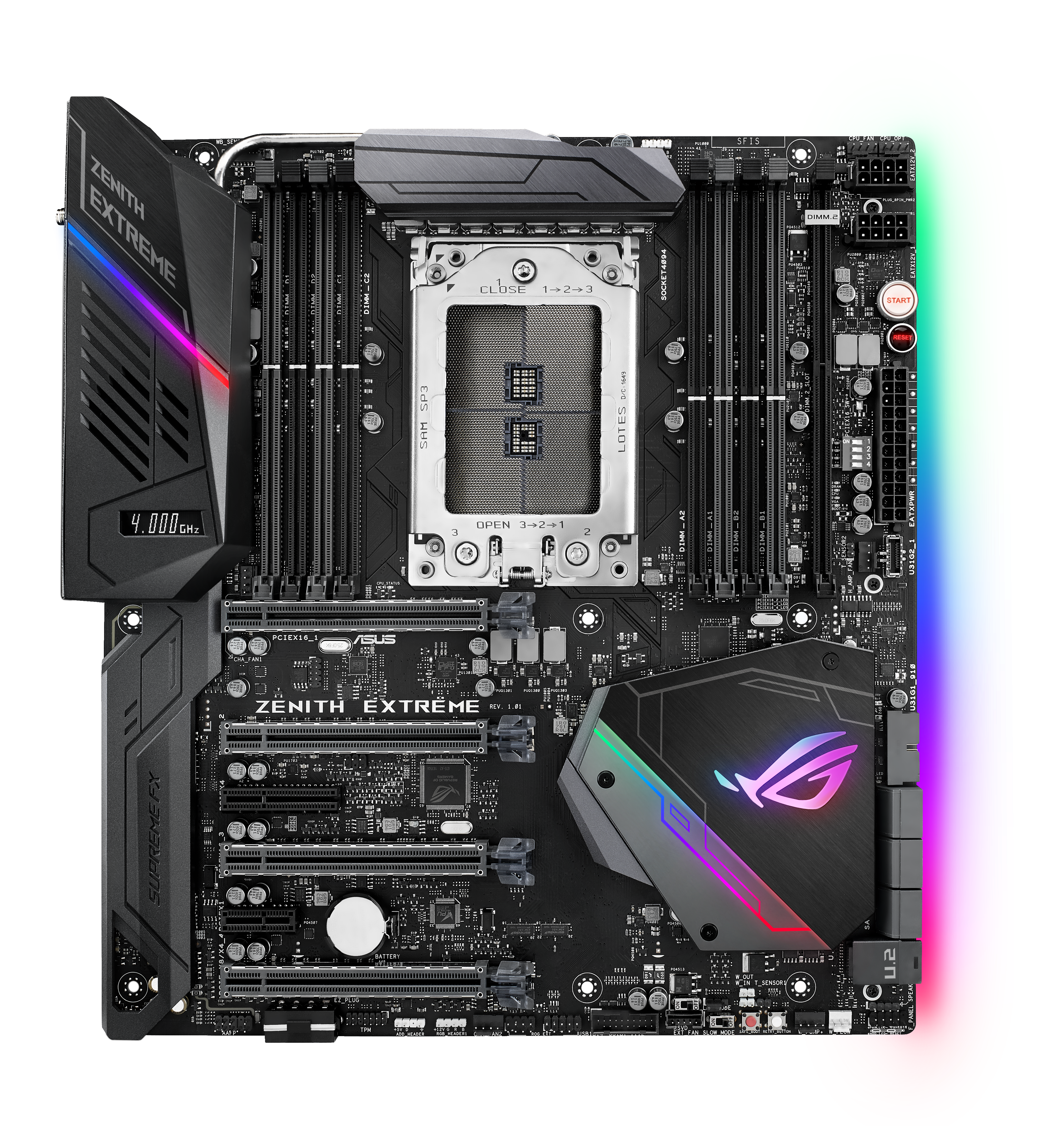 All of Asus’s X399 motherboards will have four x16 PCIe slots hooked up to the CPU but the ROG Zenith differs from the rest by also being designed for that many graphics cards. This is achieved by spacing out the slots correctly for thicker GPU coolers. To try and reduce GPU sag, this board also comes with an ROG VGA holder, which can give your GPU some extra support.