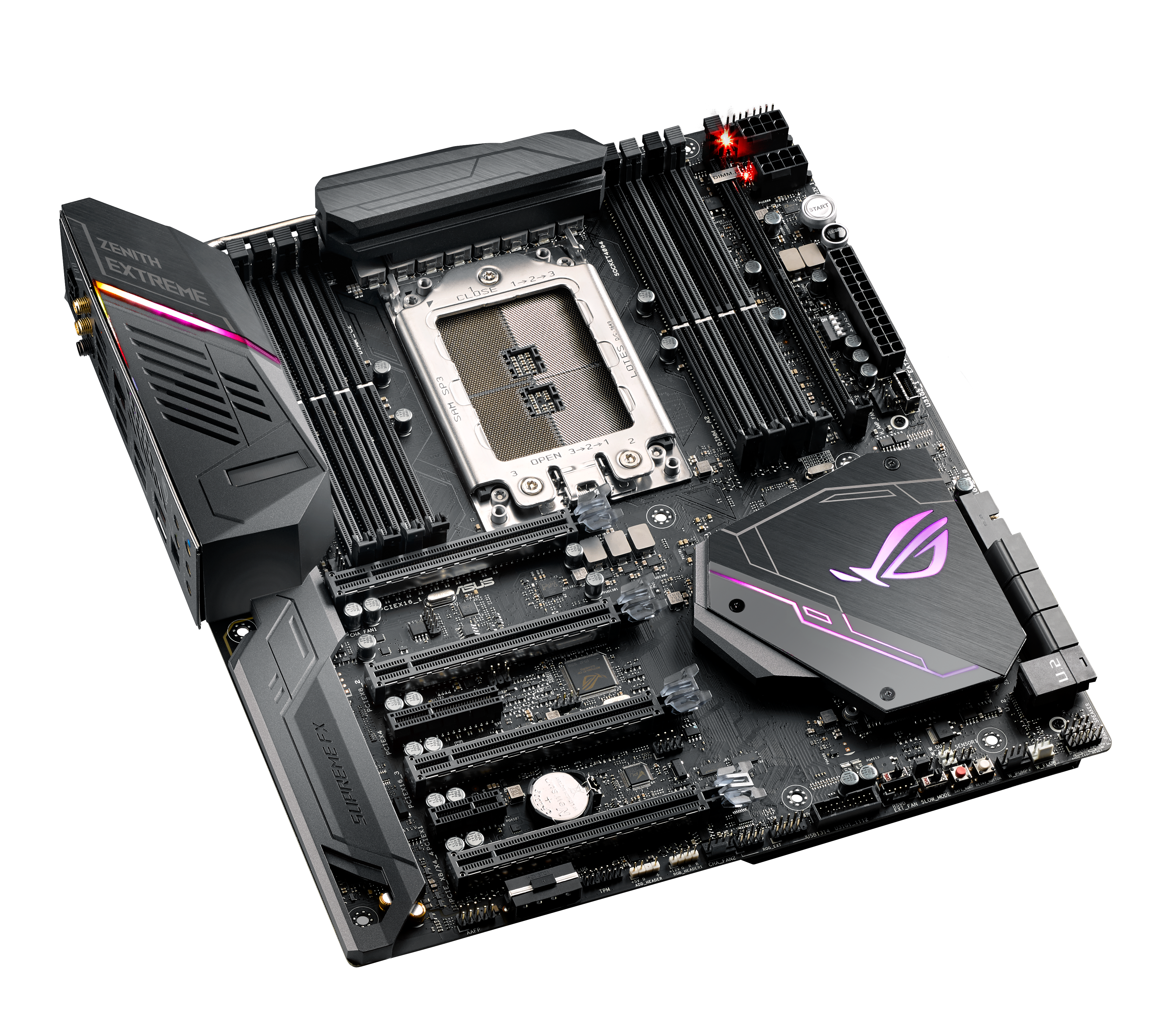 Let’s start off with the ROG Zenith Extreme, which you can see pictured above. This board is the flagship of the ROG X399 lineup and comes with all of the latest features on board. This particular board is built with custom liquid cooling in mind, thanks to a mono blocks connector, which lets users with compatible hardware monitor things coolant flow and temperature, or even leaks, all using one single cable. This also frees up space for individual pump, temperature and flow headers for a dedicated GPU cooling loop. If you need a lot of fans, there is a fan extension cable that will allow you to hook up nine fans in total for maximum cooling potential.