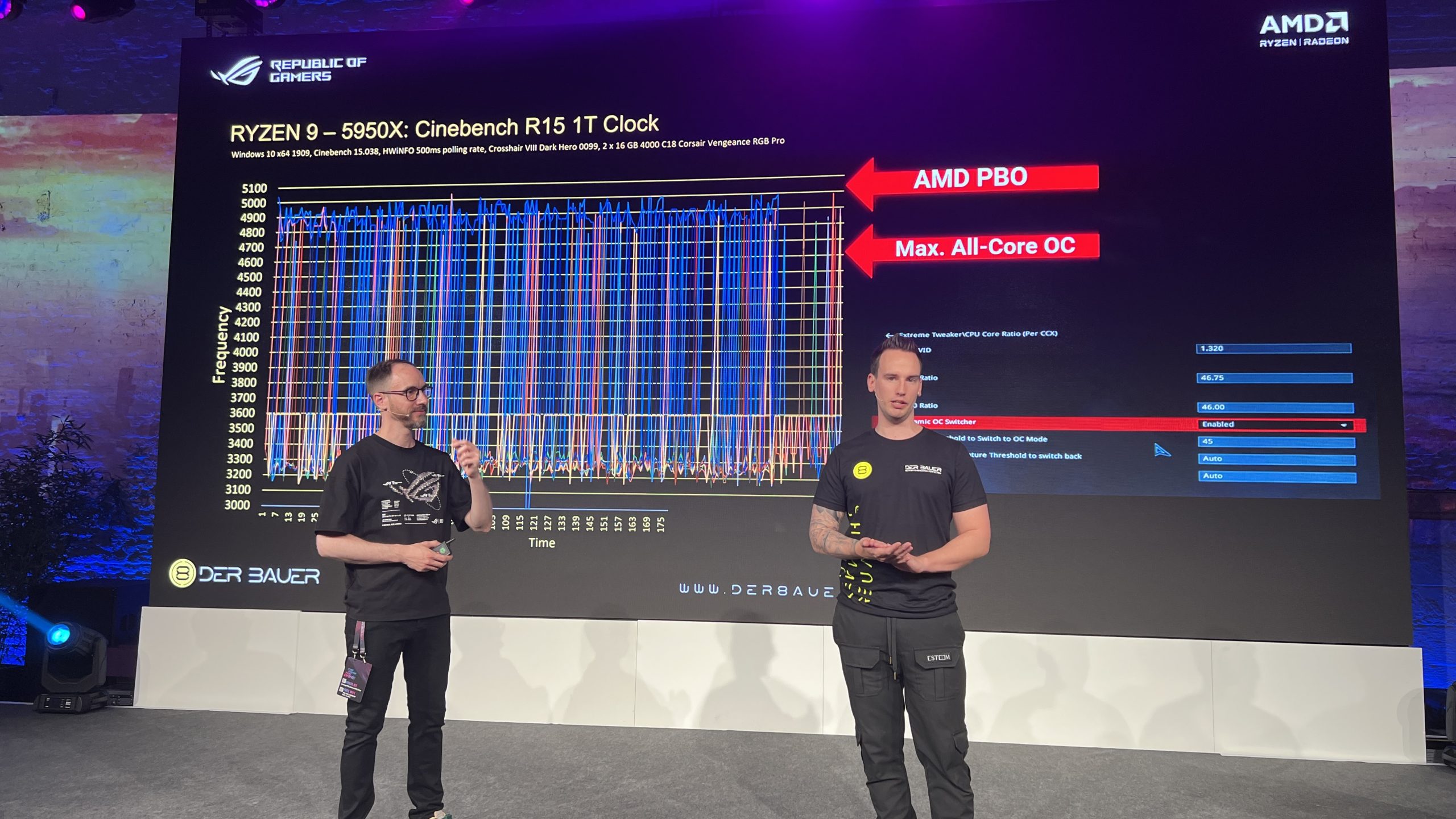 Also on hand was der8auer, mainly to highlight the fact that many of the new ASUS motherboards would support the Dynamic OC switching that was only previously seen on the Dark Hero X570 board. We were also told that after a lot of work on the new AMD packages over the past month, delidding will be possible, but it seems to be a tougher task for the new Ryzen chips compared to the old designs. The process described to us would not be for amateurs looking for a quick OC thrill.