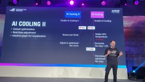 To support overclocking with the new AMD processors, ASUS has been working on Ai Cooling II – which it claims can provide instant optimisation and real-time adjustment. The initial stress test needed to set the parameters for the software happens much quicker. Fan speeds are then lowered while temps are monitored to find the sweet spot for quiet operation and cooling performance.