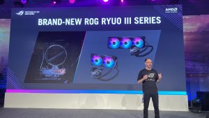 ASUS has also begun showing off its new ROG RYOU III AIO liquid cooler, which has been redesigned to enable the best possible performance on AMD's next-gen processors. The baseplate covers 32% more surface area than the previous generation, and the connecting tubes have increased from 5mm to 7mm, allowing more coolant to flow through. According to Asus, in a 100W test environment, the new design should outperform the old one by at least 2 degrees Celsius.