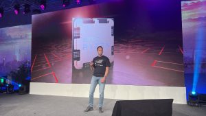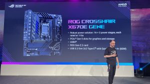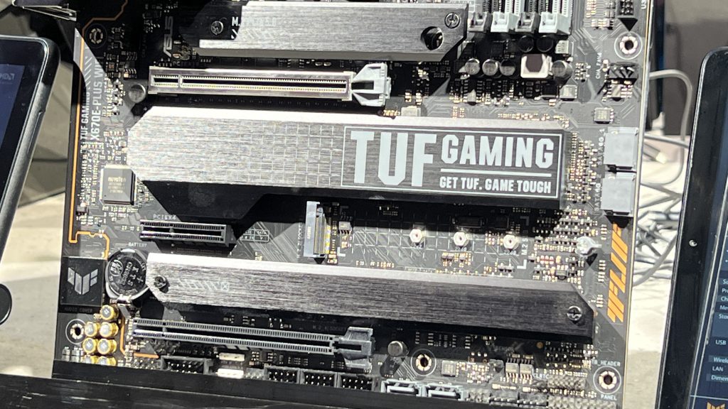 The VRM backplates are larger and more solid, so it will be interesting to see if they perform better than some we’ve seen in the past – where the designs seemed to be built around aesthetics more than thermodynamics. Connectivity was also a big theme for ASUS, and they pointed out the built-in USB4 pre-mounted I/Os on the back of the boards.