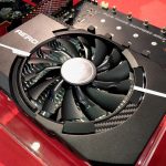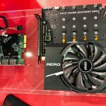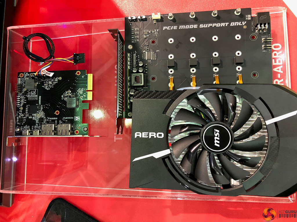 Finally, MSI also showed off a new PCIe expansion card, which essentially acts as an aircraft carrier for M.2 drives. Many of MSI's current motherboards already come with three M.2 slots, but this new card will give you room for an extra four. So for instance, this, combined with the MEG X399 would give you seven M.2 slots. Once all of the M.2 drives are attached to the PCIe card, cooling is handled by an air cooling fan, which comes in the usual MSI style.