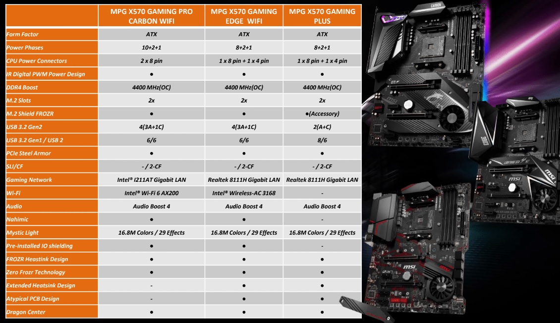 The MPG X570 Gaming Pro Carbon WiFi, X570 Gaming Edge WiFi and X570 Gaming Plus fill up a similar category. All three are standard ATX and use the same on board audio chip, support the same DDR4 memory speeds (4400MHz), support the same number of multi-GPU configurations (2-way crossfire only) and have two M.2 SSD slots. The key difference is found in the power phases, with the Gaming Pro Carbon utilising a 10+2+1 design, while the Edge and Gaming Plus use an 8+2+1 design.