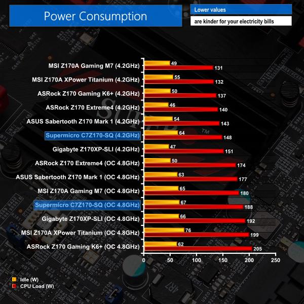 Power consumption for this motherboard is well within the acceptable tolerances of the Z170 range. It isn't the most efficient option, which is odd considering the use of efficient server components. When the overclock is set, the efficiency increases compared to the competition and the higher quality components start to make sense.
