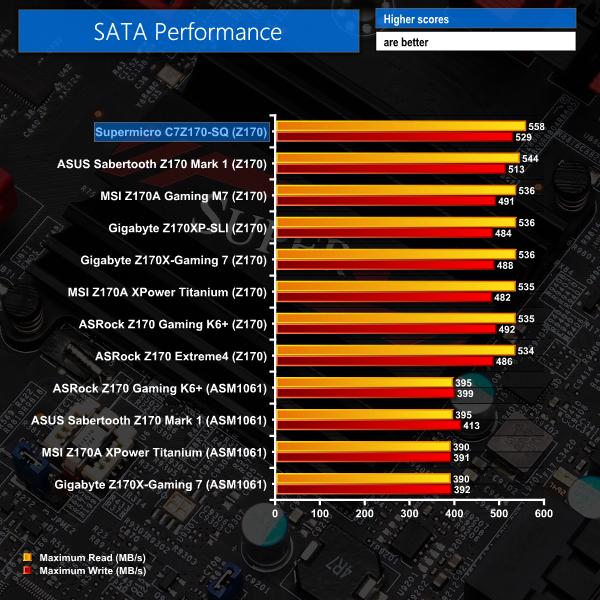 The C7Z170-SQ features only SATA ports controlled by the PCH, this allows for maximum speed without any confusion to what port to choose when installing new storage drives. The speed is well within tolerance and wouldn't be a bottleneck to any current SSDs.