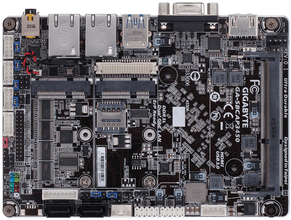 The GA-SBCAP3450 has officially appeared on Gigabyte's website and is listed with some very impressive specs. While the original Raspberry Pi rival featured a dual-core CPU, Gigabyte's latest and greatest packs an Intel Celeron N3450 quad-core chip that runs at up to 2.2GHz. Also included are two Mini-PCIe slots, dual gigabit LAN, internal Audio, USB headers and a single SO-DIMM slot for DDR3L RAM. It even has two SATA3 internal connectors to be taken advantage of. In terms of display outputs, it supports a maximum of 4K at 30Hz over HDMI.