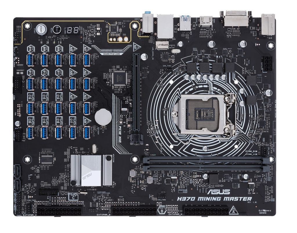 The Mining Master is an ATX board that uses the H370 chipset, so it supports Coffee Lake generation CPUs, including the Intel Core, Pentium, and Celeron processors (the latter of which miners are most interested in). It also features support for Gigabit LAN, two SATA 3 6Gbps ports, and two DIMMs of DDR4 RAM (32GB and 2666MHz max).