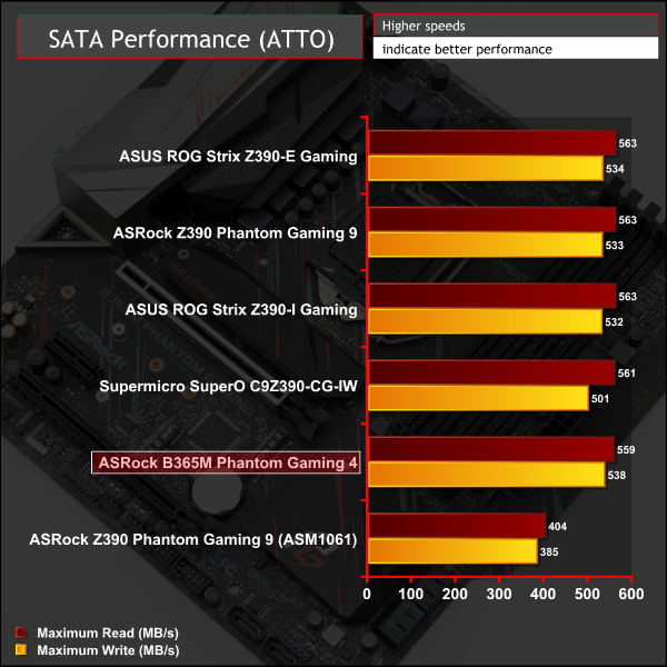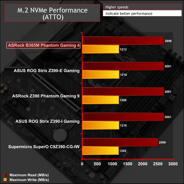 M.2 performance is as expected for the 32Gbps PCIe 3.0 X4 link and the M.2 heatsink does an adequate job of keeping thermals out of the throttling zone, even under prolonged (10 minutes +) stress testing.