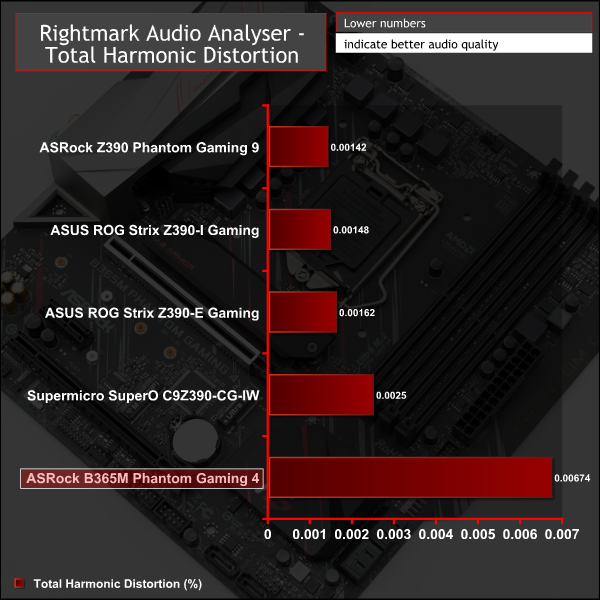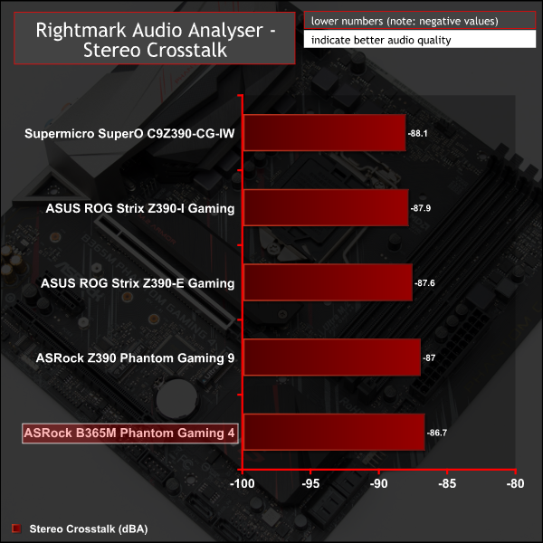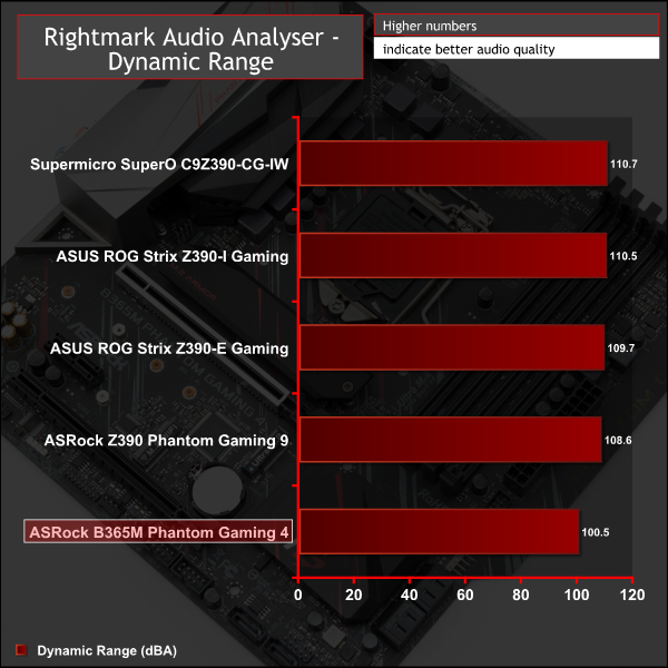 The audio performance of the ASRock B365M Phantom Gaming 4 is still good but the results have enough difference from all other tested boards to suggest that the “ALC1200” is in fact different to the “ALC1220” currently used by many other gaming motherboards. The ALC1200 performs worse than ALC1220, but is still rated as “Very Good” overall by Rightmark Audio Analyser.