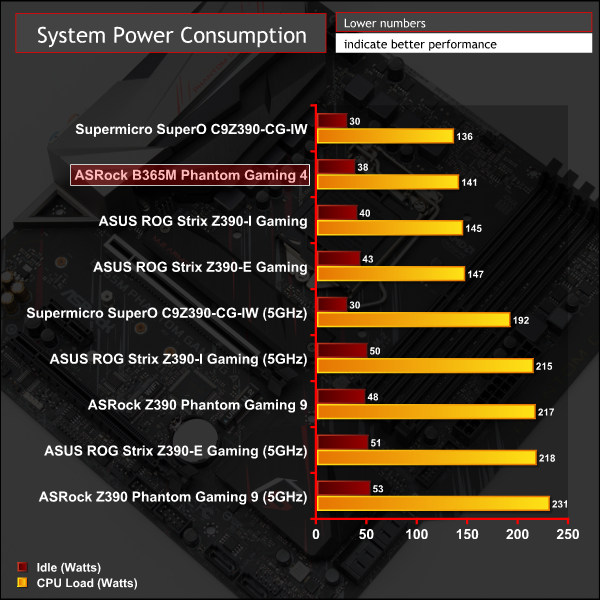 We leave the system to idle on the Windows 10 desktop for 10 minutes before taking a reading. For CPU load results we run AIDA64 CPU, FPU, Cache and Memory stress tests and take a reading after 10 minutes. The power consumption of our entire test system (at the wall) is shown in the chart.