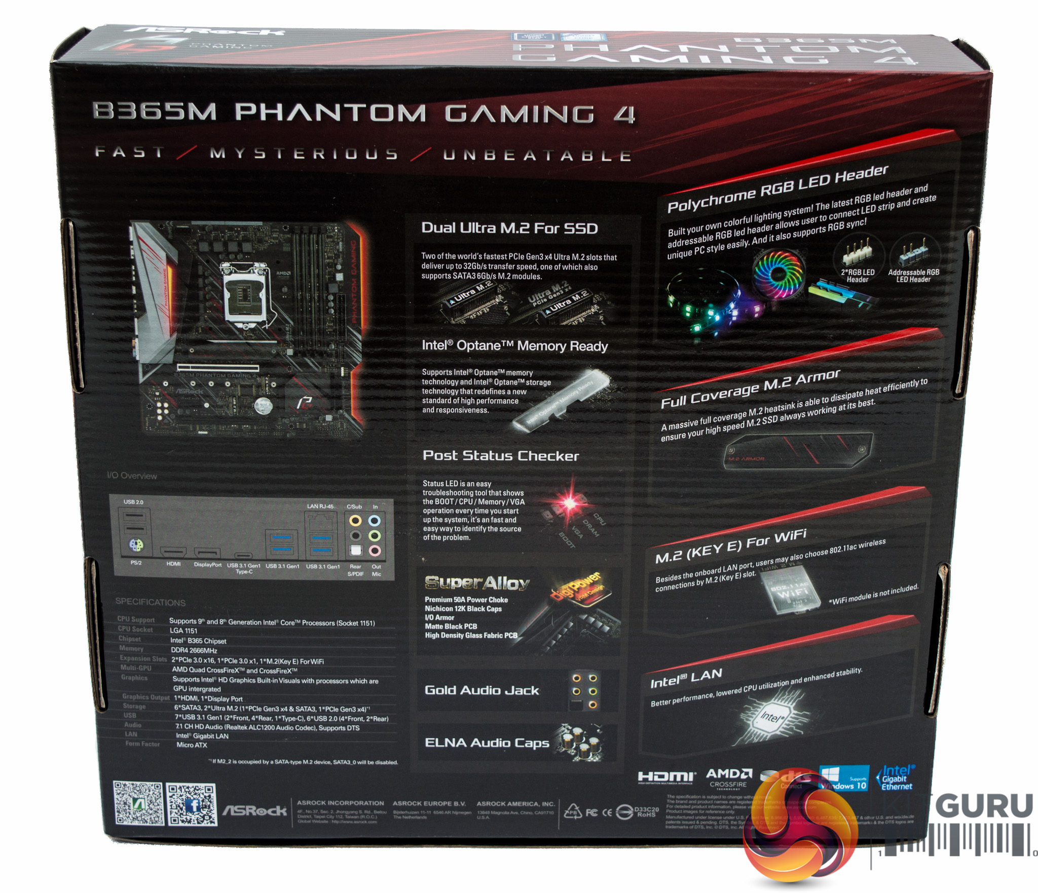 The ASRock B365M Phantom uses the company's Phantom Gaming moniker, which seems to have phased out the Fatal1ty branding of prior generation products. The packaging highlights a number of features including dual M.2, a debug LED, M.2 cooling, Polychrome RGB lighting and some “enhanced” quality audio and VRM components.