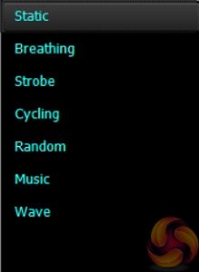 The way the colours and modes are changed is the same as predecessor software. It works by selecting the colour on the outer ring first, then the inner square after and then you can pick the style from the drop down menu, there are currently 7 modes as shown above. It’s also possible to select the colour using the RGB sliders.