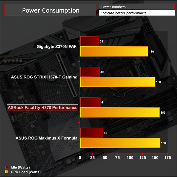 Power consumption is in line with non-overclocked Z370 motherboards, perhaps a little lower because of the slower memory, though this is easily offset by variations in the way each motherboard vendor applies vCore voltage.