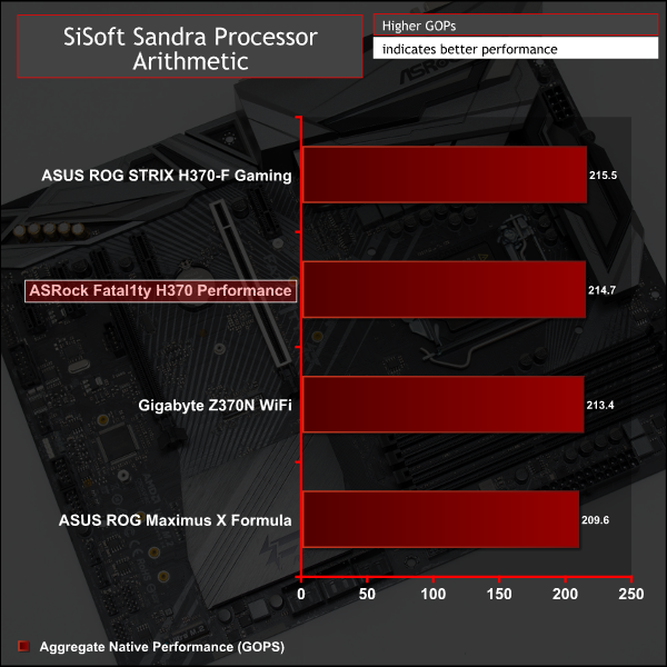 SiSoft Sandra 2017 is a multi-function utility program that supports remote analysis, benchmarking and diagnostic features for PCs, servers, mobile devices and networks. We run the application’s processor arithmetic test to gauge the CPU performance on each tested motherboard.