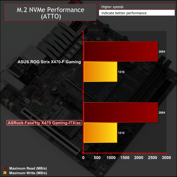 M.2 performance on this motherboard facilitates the maximum the test drive is capable of, however, the lack of M.2 cooling means thermal throttling does happen after just a couple of minutes. M.2 cooling is something ASRock could have considered given we've seen it before on other mini-ITX motherboards, such as the Gigabyte Z370N-WiFi.