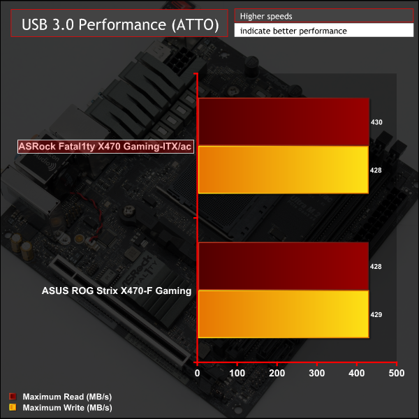 USB 3.0 performance was fairly typical for both X470 motherboards, though about 30-35MB/s lower than KitGuru observed on Intel's 300-Series.