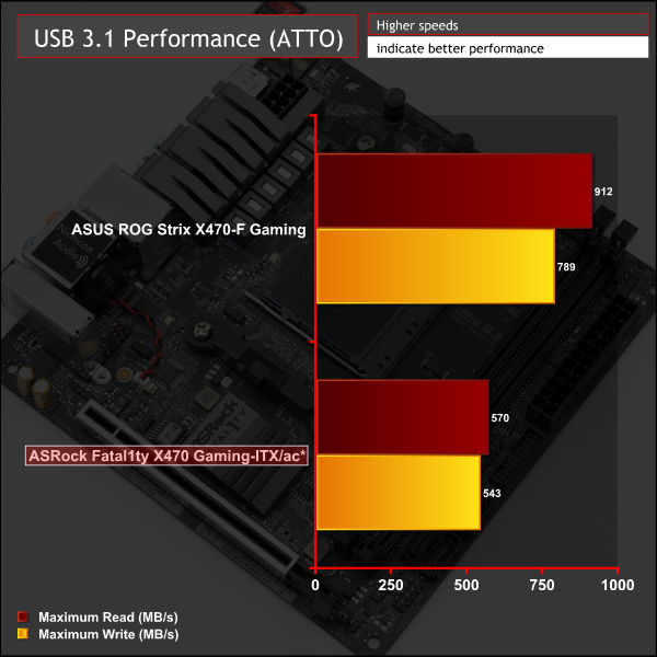 On the ASUS X470-F motherboard, we were only able to test the USB 3.1 port using the ASM1142 controller, not the front panel port using the X470 chipset controller, thus it remains to be determined if this is a motherboard-specific or chipset-specific compatibility problem. Similarly USB 3.1 performance on Intel 300-series motherboards was better than the ASUS X470-F to the tune of an extra 150MB/s.