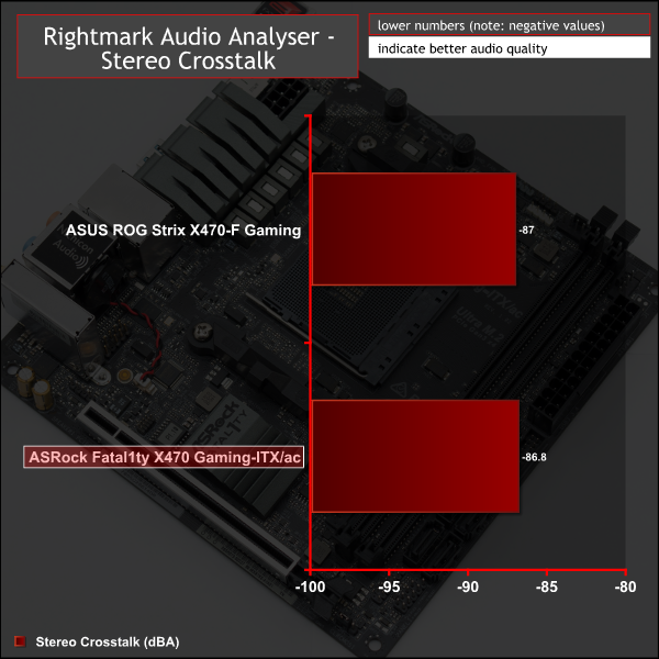 The performance is in line with what we've seen from other Realtek ALC1220 codec based motherboards including Z370 motherboards using the same codec. The performance for the ASRock X470 mini-ITX motherboard was a little bit worse than the ASUS X470-F motherboard, probably reflecting the higher congestion on the PCB and fewer audio capacitors in use due to space constraints.