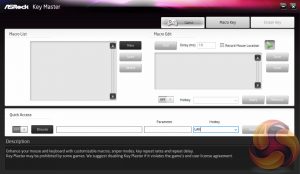 ASRock Key Master is similar to the ASUS ROG Keybot, except it is a purely software-based implementation, ASUS implements a specific IC to control its key macro functions. This means the ASRock solution has a little bit less functionality and in practice the software is a bit clunky. The lack of user experience and usability testing for software development with ASRock's customers is evident, though other motherboard vendors are equally guilty of this.