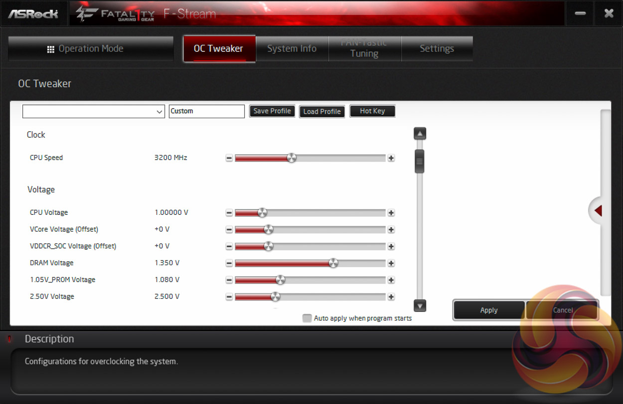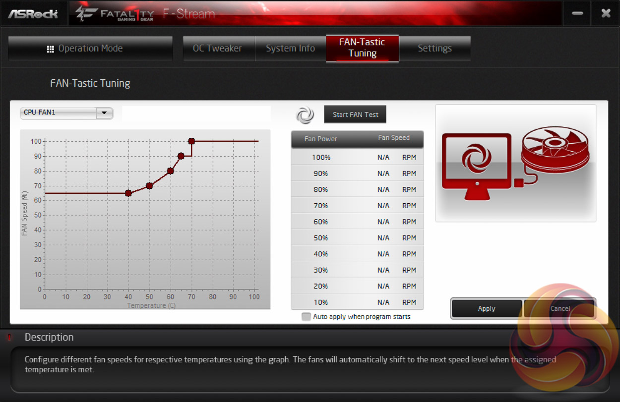 F-Stream, the Fatal1ty-branded A-Tuning, is ASRock’s equivalent to ASUS AI Suite, Gigabyte EasyTune and MSI Command Centre. This software allows you to overclock on the fly (OTF) and tune the fan speeds with the ASRock Fan-Tastic tuning. It’s a reasonably well polished piece of software, is light on system resources and not very intrusive.