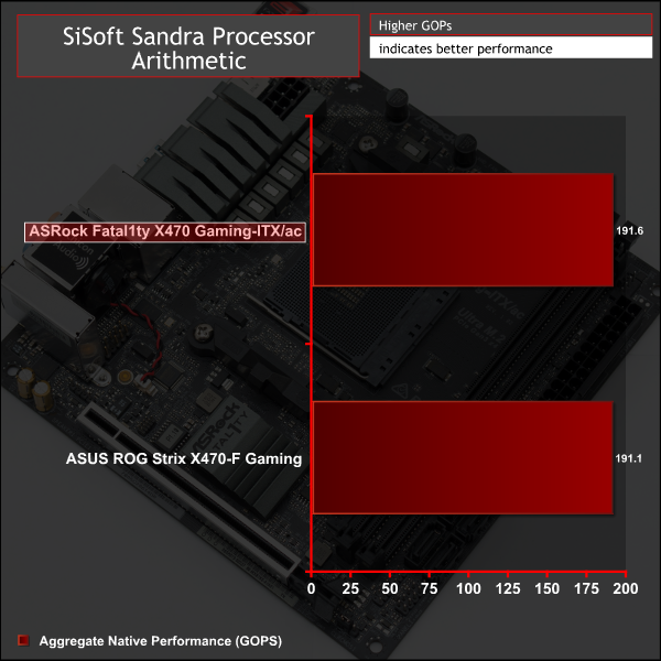 SiSoft Sandra 2018 is a multi-function utility program that supports remote analysis, benchmarking and diagnostic features for PCs, servers, mobile devices and networks. We run the application’s processor arithmetic test to gauge the CPU performance on each tested motherboard.