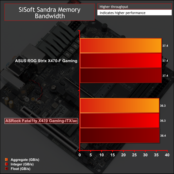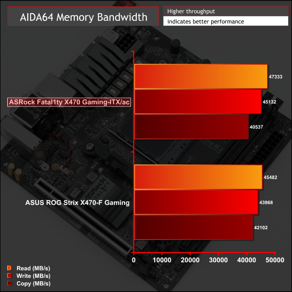 Memory performance was very similar between the two X470 motherboards on test, with the variation that we did observe possibly down to the fact the ASRock X470 ITX motherboard was only using two memory modules (ITX form factor limitation) compared to the four memory modules on the ASUS X470-F motherboard.