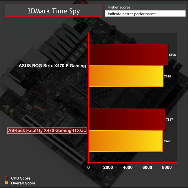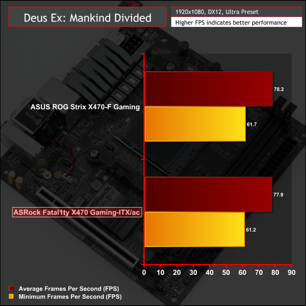 Gaming performance was mostly similar but the ASUS X470-F motherboard seemed to have a slight edge in some tests – perhaps down to more memory, a better VRM facilitating faster frequencies or some other explanation such as random testing error.