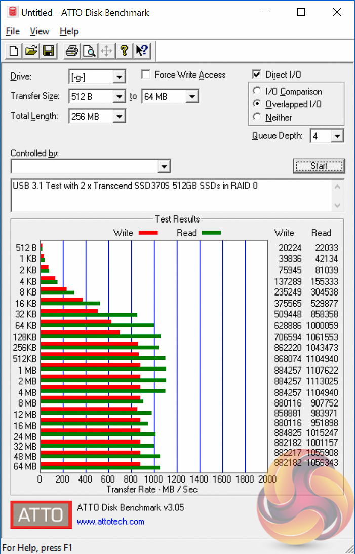 We test USB 3.0 and 3.1 performance using a pair of Transcend SSD370S 512GB SSDs in RAID 0 connected to an Icy Box RD2253-U31 2-bay USB 3.1 enclosure powered by an ASMedia ASM1352R controller.