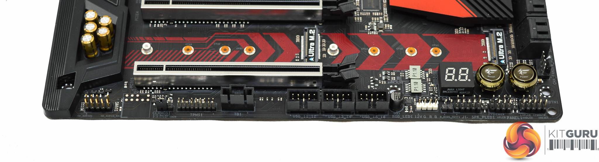 Connectivity at the base of the motherboard includes an ample three USB 2.0 headers, a 12v G R B header for LED strips, power & reset buttons and a debug code reader.