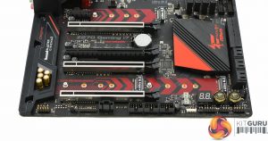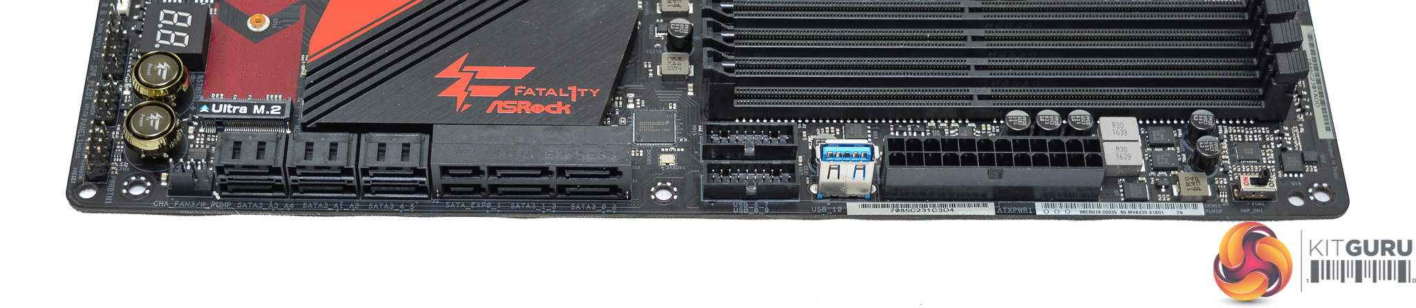 Running along the side of the motherboard there are ten SATA ports, four of which shared with two SATA Express ports, two USB 3.0 headers and a vertical Type-A USB 3.0 port. ASRock places an XMP switch by the memory lanes which is a tad gimmicky given you can easily enable XMP from within the UEFI.