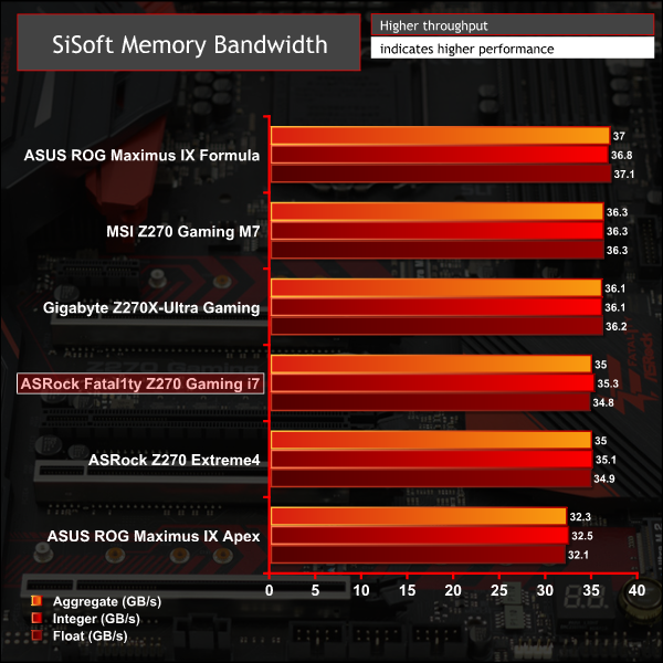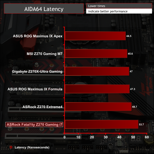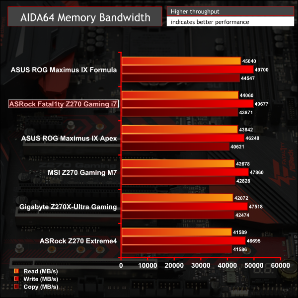 In the SiSoft bandwidth test the Fatal1ty Gaming i7 matched the Extreme 4 very closely but in AIDA64 bandwidth numbers were considerably better, though at the expense of latency.