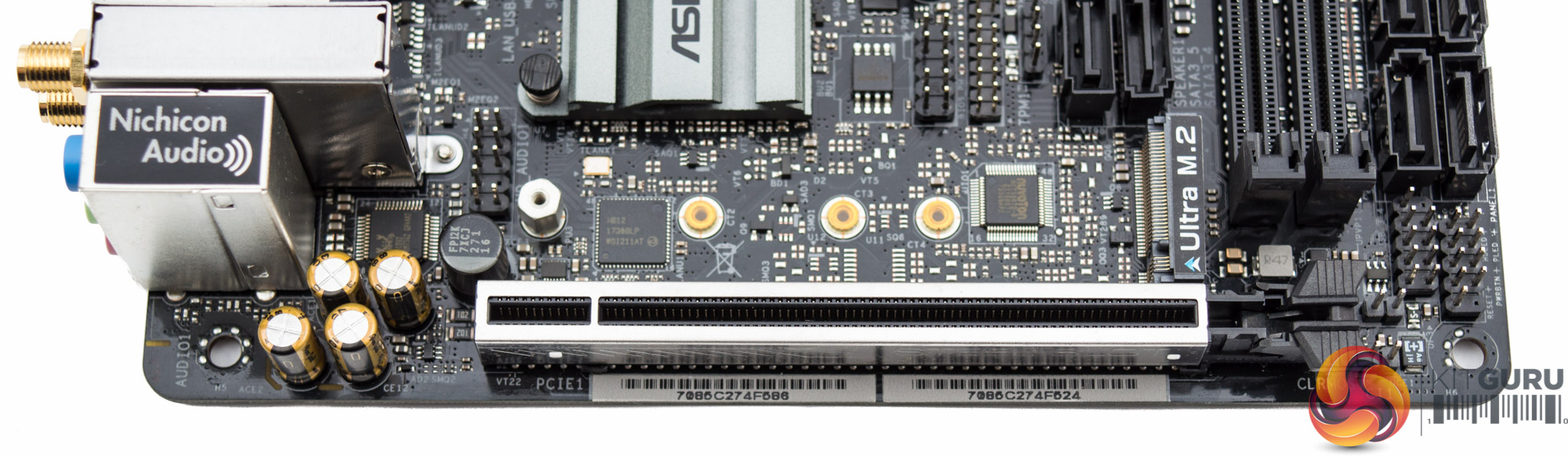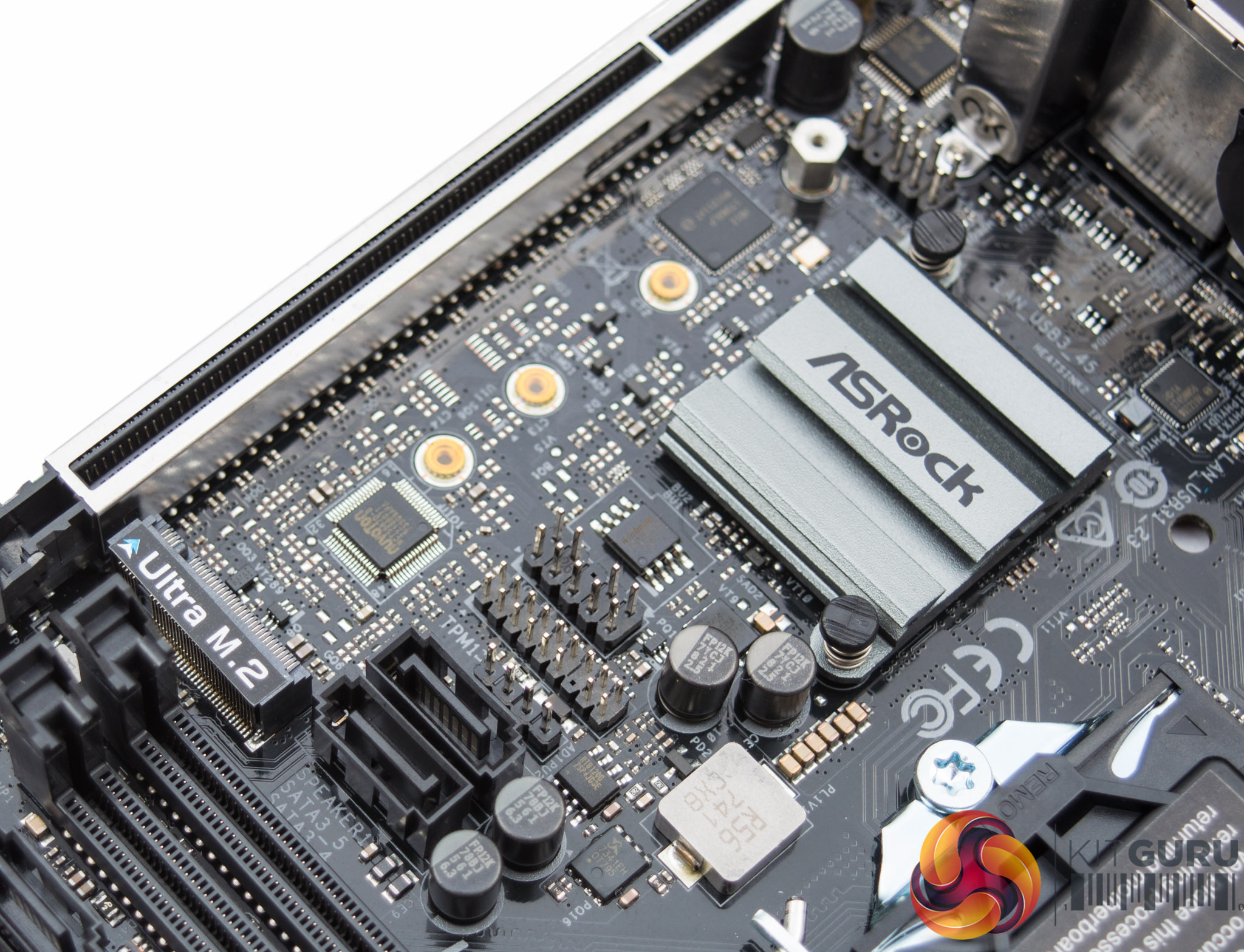 There are six vertically-facing SATA ports located either side of the two DDR4 slots. The M.2 slot sits between the reinforced PCIe slot and the chipset heatsink, up to 80mm M.2 devices are supported with SATA or PCIe operational modes.